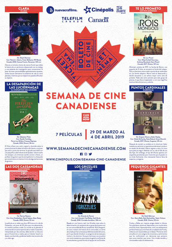 La Semana de Cine Canadiense se exhibirá en el espacio de Sala de Arte Cinépolis en la CDMX, Guadalajara, Puebla y Querétaro del 29 de marzo al 4 de abril. Y del 5 al 28 de abril, continuará su recorrido dentro del Circuito Cultural por diferentes ciudades de la República Mexicana, como la CDMX, Monterrey, Guadalajara, Puebla, Querétaro, Aguascalientes, Cuernavaca, Durango, San Miguel de Allende, Tijuana, Zacatecas, Campeche, Tulancingo y Toluca.
