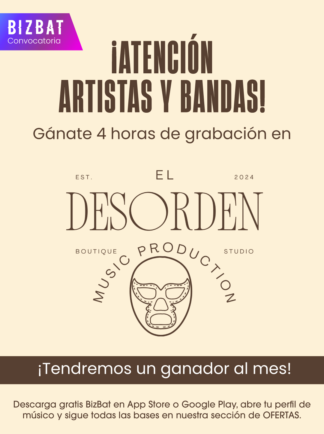 Cada mes, El Desorden Estudio, en colaboración con BizBat, seleccionará a un artista para regalarle 4 horas de grabación en el estudio.