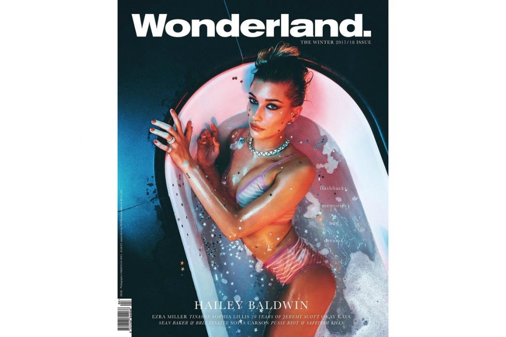 La revista Wonderland ha compartido la portada de su número de invierno 2017/2018 y en donde podemos a ver a la modelo Hailey Baldwin, quien es fotografiada por Christian Oita en una tina con burbujas mientras usa joyería de BVLGARI.