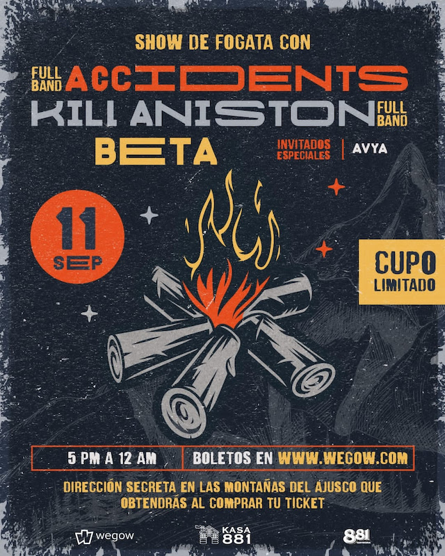 Kasa 881 anunció un nuevo concierto este próximo 11 de septiembre con Kill Aniston, Accidents, quienes se reunirán en un mismo escenario para tocar con banda completa e invitados especiales como Beta y Avya.